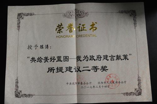 為表彰和鼓勵踴躍為沈陽振興發(fā)展獻(xiàn)計(jì)獻(xiàn)策的熱心市民,2月14日,在全面推進(jìn)幸福沈陽共同締造行動動員部署大會上,遼寧省委副書記、沈陽市委書記王蒙徽等領(lǐng)導(dǎo)為評選出的優(yōu)秀建議者代表頒發(fā)證書。沈陽應(yīng)用生態(tài)研究所退休研究員陳濤提交的建議《振興東北老工業(yè)基地,人才是第一資源》獲得建言獻(xiàn)策二等獎。
