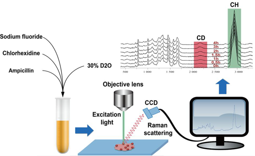 圖1. 基于重水標(biāo)記單細(xì)胞拉曼成像的藥物抗菌效果評價(jià)技術(shù)示意圖