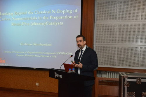 來(lái)訪期間,GIAMBASTIANI Giuliano教授為金屬所科研人員和研究生作了題目為“Looking Beyond the Classical N-Doping of Carbon Nanomaterials in the Preparation of Metal-Free (electro) Catalysts”的李薰獎(jiǎng)報(bào)告。報(bào)告前,張健副所長(zhǎng)代表金屬所為GIAMBASTIANI教授頒發(fā)了李薰講座獎(jiǎng)獎(jiǎng)牌。頒獎(jiǎng)儀式和報(bào)告由蘇黨生研究員主持。報(bào)告得到了金屬所科研人員和研究生的熱烈歡迎,聽眾紛紛踴躍提問,就感興趣的問題與GIAMBASTIANI教授進(jìn)行討論。來(lái)訪期間,GIAMBASTIANI Giuliano教授與金屬所科研人員和研究生進(jìn)行了深入交流。