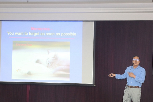 報(bào)告會(huì)上,王院士用淺顯易懂的語(yǔ)言生動(dòng)的講述了記憶的形成、維持和消退的細(xì)胞分子機(jī)制。通過(guò)報(bào)告,大家了解到大腦的海馬區(qū)是產(chǎn)生記憶的關(guān)鍵部位。外界環(huán)境信息在神經(jīng)元間的突觸部位以電信號(hào)形式進(jìn)行傳遞,突觸傳遞效能具有可塑性,這種可塑性被認(rèn)為與學(xué)習(xí)記憶功能密切相關(guān)。研究表明利用多肽ZIP可以使已經(jīng)形成的記憶消除。通過(guò)分子生物學(xué)、電生理和行為學(xué)等實(shí)驗(yàn)手段,王玉田院士研究團(tuán)隊(duì)發(fā)現(xiàn),利用人工合成的多肽GluA23Y可以引起記憶增強(qiáng),這一成果為研究開發(fā)針對(duì)阿爾海茨默疾病的臨床藥物提供了可能,為改善和攻克學(xué)習(xí)記憶障礙提供了新的思路。王院士的報(bào)告引起了與會(huì)聽眾的廣泛興趣,多位研究生與王院士就人類記憶問(wèn)題進(jìn)行了交流,獲得大家一致好評(píng)。