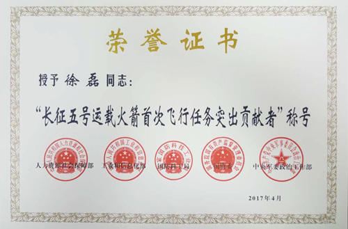徐磊研究員獲“長征五號運載火箭首次飛行任務(wù)突出貢獻者”榮譽稱號。