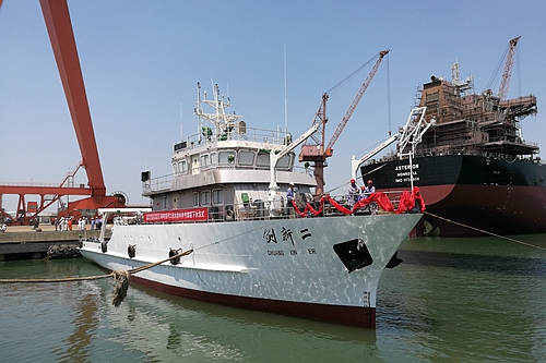 5月18日,中國(guó)科學(xué)院海洋研究所300噸級(jí)河口淺水型科學(xué)考察船“創(chuàng)新二”在山東蓬萊順利下水。海洋所黨委書記王輝、蓬萊市黨組成員王成海、中柏京魯船業(yè)有限公司董事長(zhǎng)王轟等出席下水儀式。