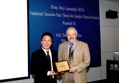 6月8日,美國科學院院士、美國明尼蘇達大學化學系的校董事講座教授Donald G. Truhlar應中國中科院大連化學物理研究所邀請,在生物樓學術報告廳做了題為“Variational Transition State Theory for Complex Chemical Reactions”的張大煜講座特邀學術報告。報告由分子反應動力學國家重點實驗主任張東輝研究員主持。副所長金玉奇代表大連化物所向Truhlar頒發(fā)了張大煜講座獎牌以及我所榮譽研究員證書。