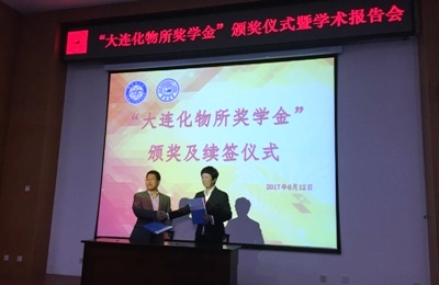 李燦、于吉紅、孫俊奇和熊博暉分別為獲獎學生頒發(fā)獲獎證書。熊博暉與孫俊奇代表雙方續(xù)簽吉林大學化學學院2017-2020年的“大連化物所獎學金”協(xié)議。