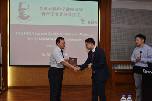 張哲峰副所長(zhǎng)為Minkee Choi博士頒發(fā)李薰青年獎(jiǎng)獎(jiǎng)牌