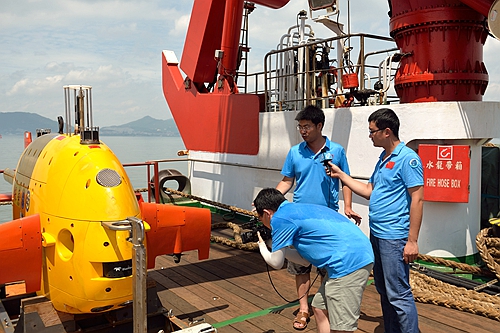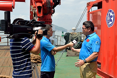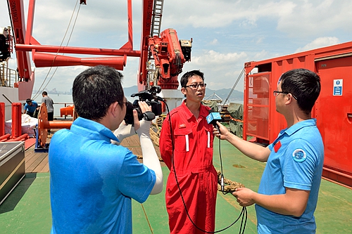 在近10分鐘的直播時間里,央視記者向全國觀眾展示了本次科考任務中的“探索”號AUV,“發(fā)現(xiàn)”號ROV、深海生態(tài)過程長期定點觀測系統(tǒng)(3000米著陸器)、拉曼光譜原位定量探測系統(tǒng)等先進的探測設備,介紹了本次科考任務及亮點,并采訪了中科院海洋專項首席科學家、中科院海洋研究所孫松研究員。中央電視臺綜合頻道在隨后的新聞節(jié)目中也對“科學”號本次任務進行了報道。直播結(jié)束后,山東電視臺等記者還對“探索”號AUV總體技術負責人、中科院沈陽自動化研究所副研究員趙宏宇,“發(fā)現(xiàn)”號ROV負責人、中科院海洋所工程技術部工程師吳岳等人員進行了采訪。