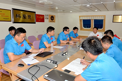晚上7點,本航段首次工作協(xié)調(diào)會在四樓會議室召開。會議由航段技術首席科學家、中科院沈陽自動化研究所副所長李碩研究員主持,中科院重大科技局王越超局長,海洋專項首席科學家、中科院海洋研究所孫松研究員,航次綜合協(xié)調(diào)人、中科院海洋所船舶保障部李雷溪主任,調(diào)查隊長王昊,船長劉合義,船載實驗室主任孫宇峰及各設備主要負責人參加了會議。李碩研究員對本次科考任務進行了總體部署,與會人員討論交流了具體作業(yè)情況,王越超局長、孫松研究員分別對確保船舶和人員作業(yè)安全、保障任務順利完成進行了強調(diào),提出了相關建議。