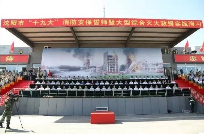 當(dāng)日上午9點(diǎn)30分,沈陽市“十九大”消防安保誓師暨大型綜合滅火救援實(shí)戰(zhàn)演習(xí)在消防訓(xùn)練基地隆重舉行。沈陽市政府各委辦局,全省消防部隊(duì),各區(qū)、縣(市)政府領(lǐng)導(dǎo),市、區(qū)兩級公安機(jī)關(guān)、警種支隊(duì)領(lǐng)導(dǎo)和社會(huì)各界代表共1700多人參加了活動(dòng)。835名消防官兵,158臺(tái)各種消防車輛投入演習(xí)。