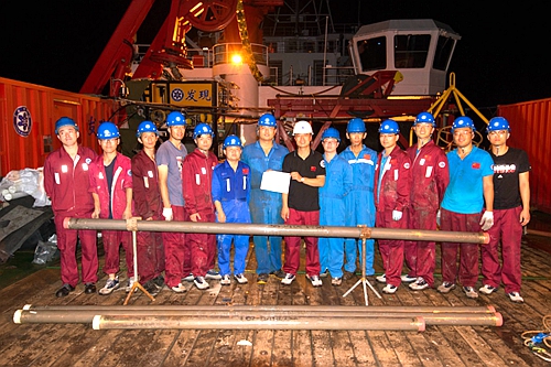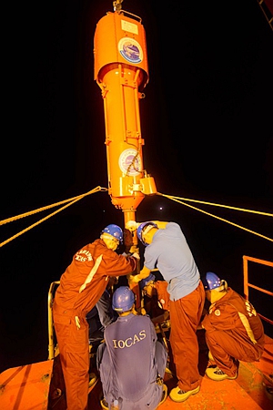 凌晨4點(diǎn),“開拓3500”即將出水,所有在場隊(duì)員心中既緊張又期待,尤其對本航次首席科學(xué)家、“開拓3500”設(shè)備研制負(fù)責(zé)人欒振東高級工程師來說更是如此。第一次下水共取樣14.2m,而這一次會不會有新的突破呢?最終經(jīng)過拆卸、取樣、測量,第二次下水共取沉積物柱狀樣15.25m,比第一次下水取樣長度提高1.05m,突破了該套設(shè)備設(shè)計(jì)取樣最長長度!巧合的是12日當(dāng)天正好是欒振東高級工程師的生日,而“開拓3500”取樣長度實(shí)現(xiàn)新的突破也是給他的最好生日禮物。