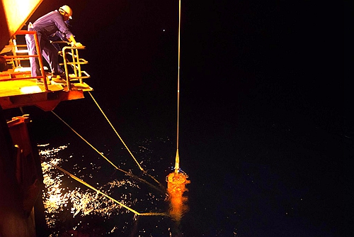 有了第一次下水的經(jīng)驗(yàn),第二次下水工作變得輕車熟路。工程技術(shù)人員開動吊車、A架,下放設(shè)備,科考隊(duì)員安裝取樣管、調(diào)試設(shè)備,配合相當(dāng)默契。