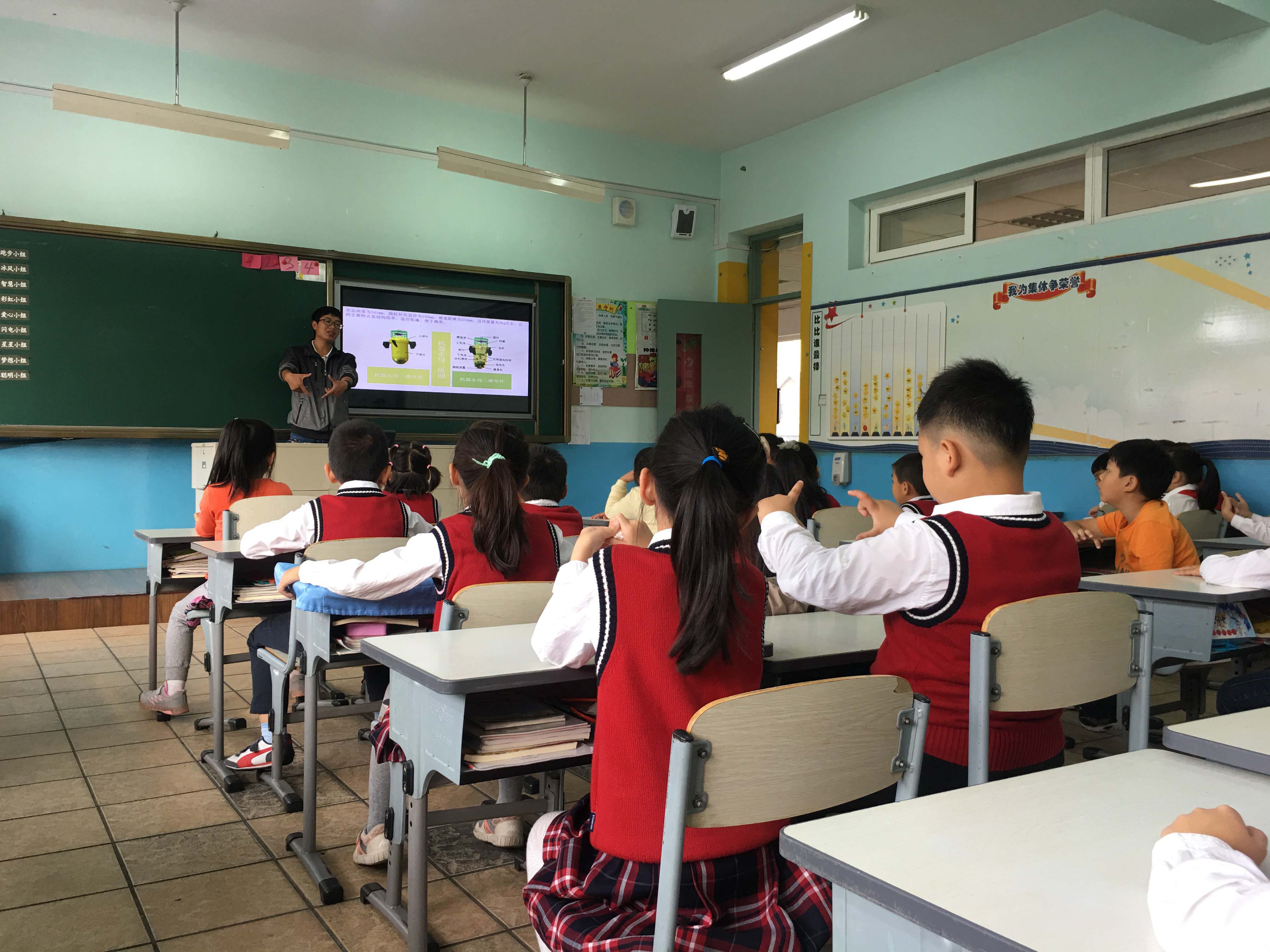 沈陽(yáng)自動(dòng)化所第二屆科普創(chuàng)意大賽獲獎(jiǎng)選手、碩士研究生白桂強(qiáng)為學(xué)生們帶來(lái)了一節(jié)主題為《仿生水母機(jī)器人》的科學(xué)小課堂。白桂強(qiáng)介紹了水下機(jī)器人分類、國(guó)內(nèi)外知名水下機(jī)器人、仿生機(jī)器人概念和自主設(shè)計(jì)的一款仿生水母機(jī)器人。生動(dòng)的講解、精彩的視頻和圖文展示,引發(fā)了學(xué)生們的強(qiáng)烈興趣。在課程后的問(wèn)答環(huán)節(jié),針對(duì)講解的內(nèi)容進(jìn)行了隨堂小測(cè)驗(yàn),學(xué)生們踴躍回答問(wèn)題,并進(jìn)行了互動(dòng)。