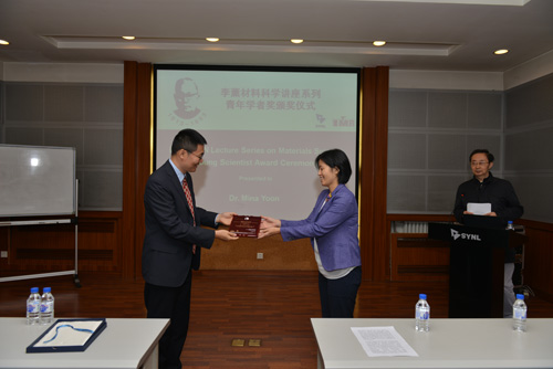 張健副所長為Mina Yoon教授為頒發(fā)李薰青年學(xué)者獎(jiǎng)獎(jiǎng)牌