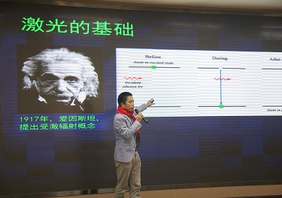 啟動(dòng)儀式后,大連化物所分子反應(yīng)動(dòng)力學(xué)國家重點(diǎn)實(shí)驗(yàn)室研究員肖春雷和催化基礎(chǔ)國家重點(diǎn)實(shí)驗(yàn)室博士生周質(zhì)文分別圍繞“神奇的激光”和“納米技術(shù)”,用生動(dòng)有趣的表達(dá)方式、通俗易懂的表現(xiàn)形式,將“高大上”的科學(xué)研究變身成“接地氣”的身邊常識(shí),緊緊地吸引著在場每一個(gè)孩子的眼球。肖春雷利用視頻和動(dòng)畫等形象地講述了神通廣大的激光與我們平時(shí)生活的息息相關(guān),周質(zhì)文則通過現(xiàn)場演示等方式,將孩子們帶入了肉眼看不到的神秘奇特的納米微觀世界?,F(xiàn)場熱烈的互動(dòng),真切地表達(dá)了孩子們對(duì)科學(xué)的好奇和對(duì)兩位老師的肯定。