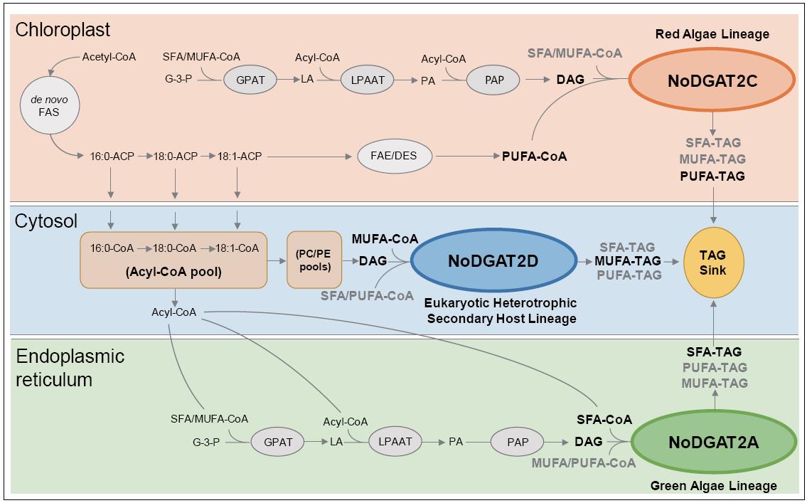 單細(xì)胞中心等前期發(fā)現(xiàn),在海洋微擬球藻基因組中編碼有多達(dá)11個(gè)II型二酰甘油?;D(zhuǎn)移酶編碼基因(DGAT2),它們催化甘油三酯合成中的最后一步也是關(guān)鍵一步。動(dòng)物和高等植物中常常只有1-2個(gè)DGAT2,為何海洋微擬球藻具有超出已知所有物種的DGAT2家庭成員數(shù)目呢?為了解答上述問(wèn)題,研究人員通過(guò)在酵母中的表達(dá)與功能分析、在體外的酶活鑒定、進(jìn)而在微擬球藻中的過(guò)表達(dá)與基因敲低等層層深入的實(shí)驗(yàn)策略,發(fā)現(xiàn)其中DGAT2A、DGAT2D與DGAT2C 具有TAG合成酶活性,而且這三個(gè)DGAT2家庭成員分別偏好飽和、單不飽和和多不飽和的脂酰CoA底物?;诖?,研究人員提出了比前期工作(Li, et al, Plant Cell, 2014)深入了一大步的油脂合成機(jī)制模型,認(rèn)為其中分別來(lái)自于三個(gè)不同祖先的DGAT2A、DGAT2D與DGAT2C,在長(zhǎng)期的共進(jìn)化過(guò)程中,形成了迥異卻互補(bǔ)的底物偏好性,而且在TAG合成的流水線上進(jìn)行著精妙的功能分工與時(shí)空協(xié)作(圖一)。