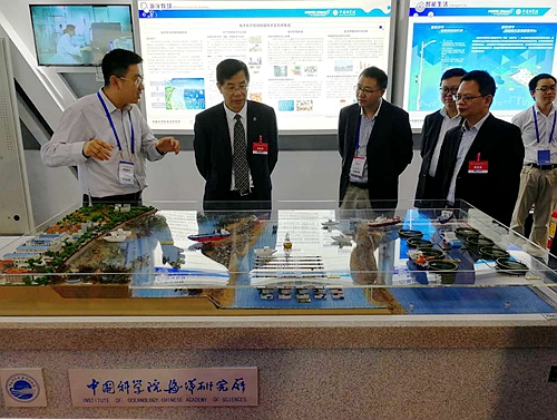 工作人員向鄧麥村秘書長(zhǎng)匯報(bào)海洋農(nóng)業(yè)領(lǐng)域技術(shù)成果