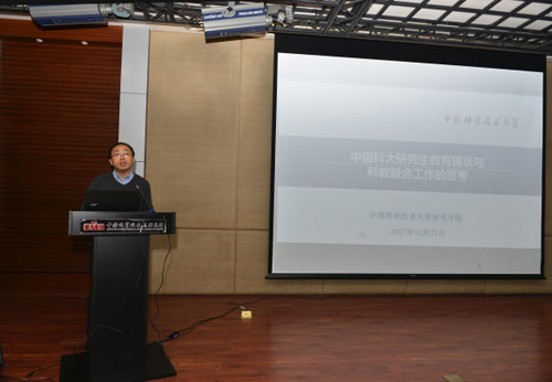 中科大研究生院吳恒安副院長作了題為“中國科大研究生教育現(xiàn)狀與科教融合工作的思考”的報告。他介紹了學(xué)??平倘诤系淖钚戮?,報告從學(xué)科建設(shè)、招生選拔、教學(xué)培養(yǎng)、獎助體系、學(xué)位工作、導(dǎo)師隊伍、培養(yǎng)質(zhì)量、科教融合學(xué)院建設(shè)與發(fā)展八個方面具體展開。報告內(nèi)容豐富、詳實,在科教融合實施過程中具有很強的指導(dǎo)意義。吳院長還就一些管理細節(jié)例如對學(xué)校制定的學(xué)位申請成果新要求等進行了詳細解讀。報告的最后,吳院長熱忱歡迎金屬所各位導(dǎo)師蒞臨中科大,共商事業(yè)、共謀發(fā)展,將科教融合學(xué)院越辦越好!