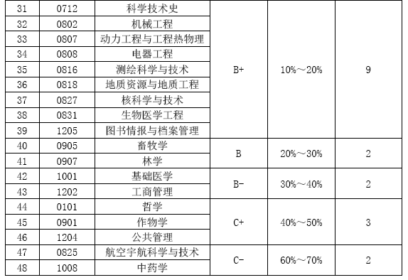 與前幾輪學(xué)科評(píng)估不同的是,本輪學(xué)科評(píng)估結(jié)果采用按百分位進(jìn)行分檔的方式,根據(jù)“學(xué)科整體水平得分”的位次百分位,將前70%的學(xué)科分為9檔公布,不公布分?jǐn)?shù)且不排具體名次,僅公布排位前70%的學(xué)科。其中,前2%(或前2名)為A+,2%~5%為A(不含2%,下同),5%~10%為A-,10%~20%為B+,20%~30%為B,30%~40%為B-,40%~50%為C+,50%~60%為C,60%~70%為C-。
