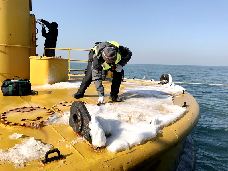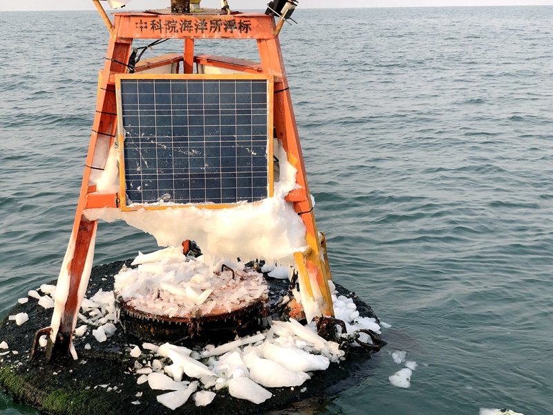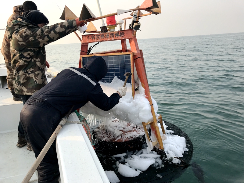 為保證春節(jié)期間近海觀測網(wǎng)絡(luò)黃海站、東海站海上觀測設(shè)施的安全穩(wěn)定運行,公共技術(shù)中心組織技術(shù)人員假期之前對在位運行的觀測浮標系統(tǒng)進行了全面系統(tǒng)的巡檢和維護。由于今冬寒潮頻發(fā),海上冰情嚴重,技術(shù)人員重點對北黃海海域和山東外海海域的浮標進行了除冰工作,以消除結(jié)冰對浮標供電系統(tǒng)的影響。