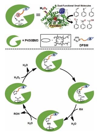 圖1.雙功能小分子驅(qū)動的P450過加氧酶和推測的催化機(jī)理