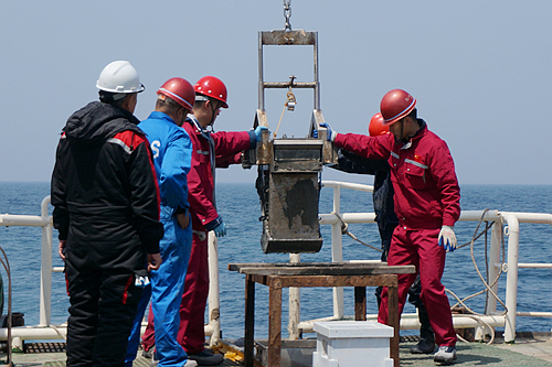 科考隊(duì)員進(jìn)行箱式采泥作業(yè)
