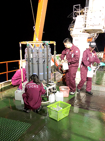科考隊(duì)員夜間在進(jìn)行采水作業(yè)