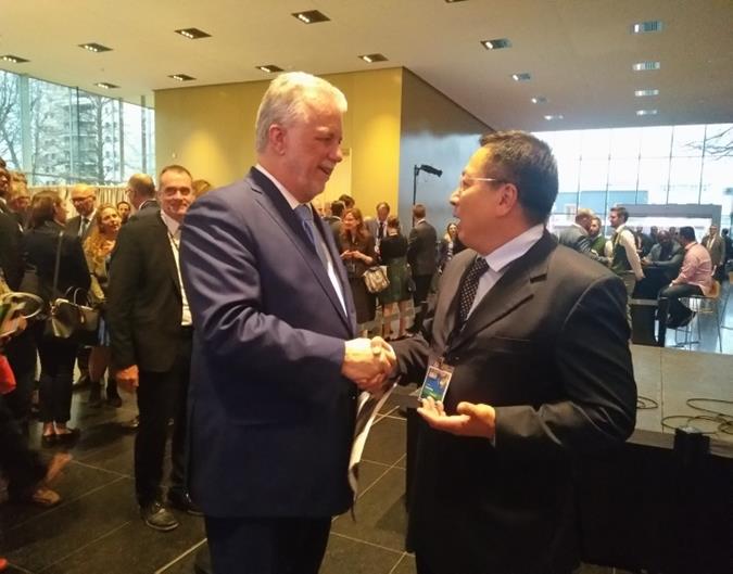 5月16日在魁北克國家美術(shù)博物館舉行的峰會(huì)開幕式上,莊慶發(fā)分別與孫繼業(yè)、魁北克省長Philippe Couillard、西開普省省長Helen Zille及多位各國嘉賓,進(jìn)行了親切友好的交談,介紹了研究所及山東省新能源相關(guān)工作。并在能源分會(huì)上,和與會(huì)能源專家闡述了山東省新能源和可再生能源發(fā)展概況及中長期發(fā)展規(guī)劃,指出“十三五”時(shí)期,是山東省調(diào)整優(yōu)化能源結(jié)構(gòu)、推進(jìn)能源轉(zhuǎn)型發(fā)展的重要戰(zhàn)略機(jī)遇期。研究所也將以“十三五”規(guī)劃作為指導(dǎo), 聚焦新能源、新材料、先進(jìn)生物技術(shù)研究領(lǐng)域,在新舊動(dòng)能轉(zhuǎn)換的重大工程中,以期與各省州相關(guān)領(lǐng)域?qū)で蠛献?,共同發(fā)展。會(huì)上各省州能源科學(xué)家討論了戰(zhàn)略能源路線的建立并創(chuàng)建了長期有效合作機(jī)制。鑒于七個(gè)省州獨(dú)特地理環(huán)境和具備條件,在新能源的利用上各有所長,通過優(yōu)勢互補(bǔ),技術(shù)共享,來共同開發(fā)可再生能源,提高能源利用率,降低成本。
