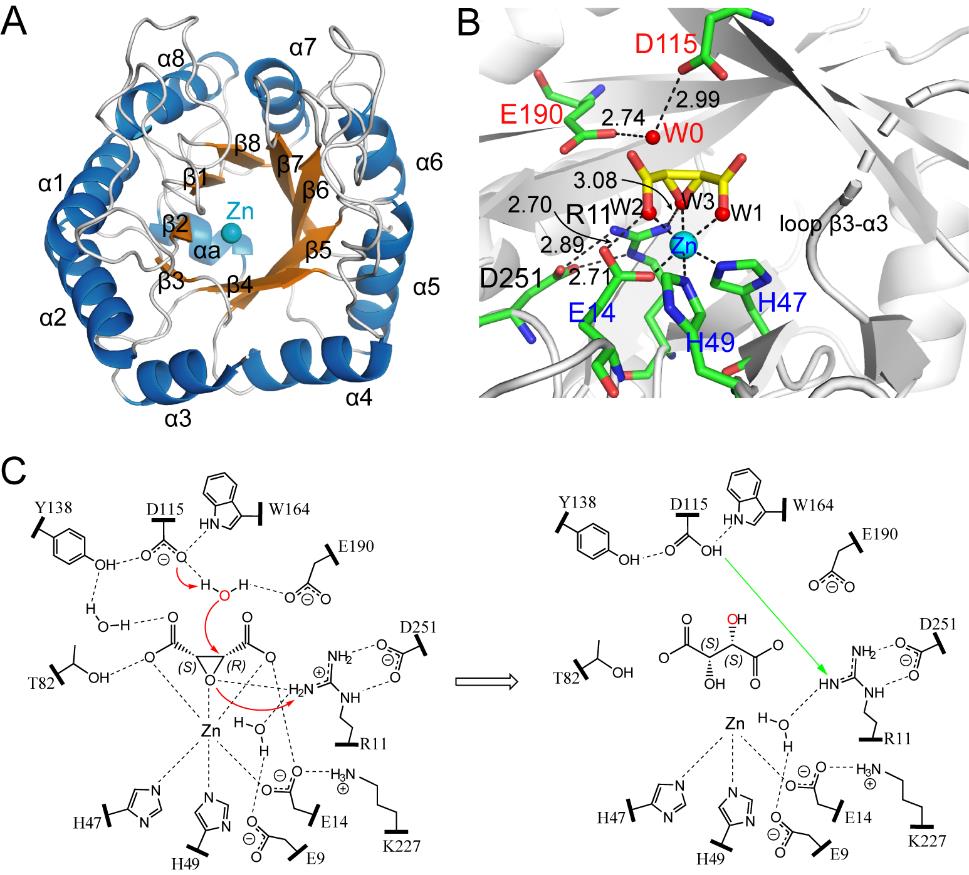 圖1 產(chǎn)D(-)酒石酸的順式環(huán)氧琥珀酸水解酶CESH[D]的結(jié)構(gòu)與催化機(jī)制。(A)CESH[D]的整體結(jié)構(gòu)。(B)CESH[D]的活性位點(diǎn)結(jié)構(gòu)及推測的底物結(jié)合模式。(C)根據(jù)結(jié)構(gòu)分析推斷的催化機(jī)制。