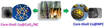 從經(jīng)濟(jì)和可持續(xù)發(fā)展的角度出發(fā),開發(fā)高活性高穩(wěn)定性的廉價(jià)和儲(chǔ)量豐富的非金屬替代稀有貴金屬催化劑,實(shí)現(xiàn)重要能源和化工過(guò)程的高效轉(zhuǎn)化是目前催化科學(xué)研究的熱點(diǎn)和挑戰(zhàn)之一。在前期研究基礎(chǔ)上,該課題組繼續(xù)以竹筍和廉價(jià)、低毒的非貴金屬鈷鹽為原料,通過(guò)優(yōu)化和調(diào)控制備方法和策略,構(gòu)建了一類新型雜原子(N,O,或P)摻雜的具有獨(dú)特核殼結(jié)構(gòu)的Co納米顆粒催化劑。研究人員充分利用生物質(zhì)竹筍本身富含的雜原子源(氨基酸、蛋白質(zhì)等),在沒(méi)有外加入模板和活化劑的條件下,開發(fā)了一條簡(jiǎn)單、綠色并可放大制備的生物質(zhì)基碳材料負(fù)載Co納米催化劑的制備方法。所制備的催化劑具有高比表面積、大孔容、分級(jí)孔等結(jié)構(gòu)特點(diǎn)。