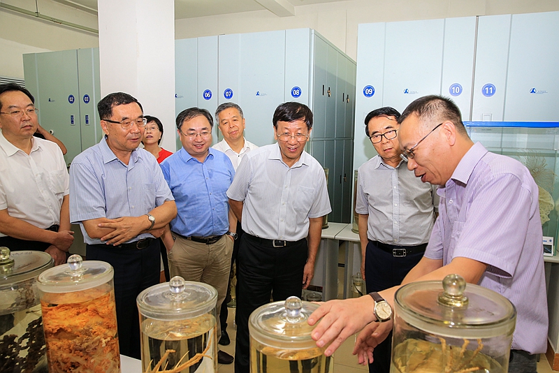 在中科院海洋生物標(biāo)本館深海樣品庫,曹建明副委員長聽取了海洋研究所在深遠(yuǎn)??瓶寄芰ㄔO(shè)、深海原位探測取樣及實驗研究方面的重要進(jìn)展及成果匯報,實地考察了海洋先導(dǎo)專項在西太平洋獲取的深海大型生物、巖石樣品及圖像、視頻資料。