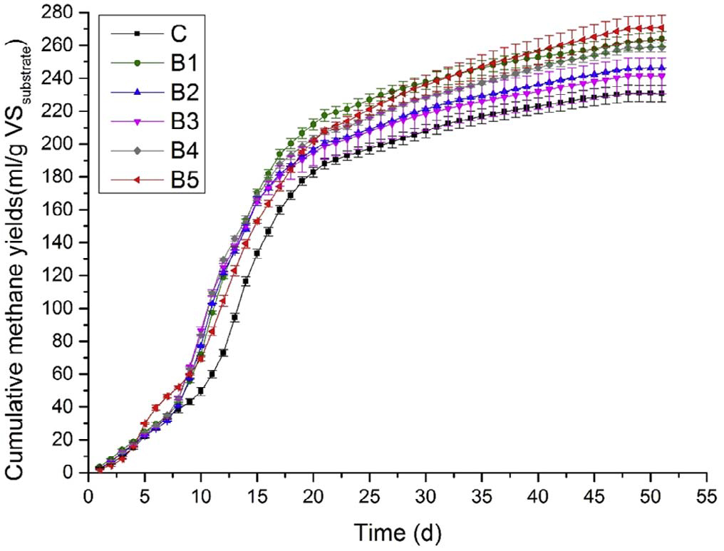 圖1微生物-微氧預(yù)處理玉米秸稈累積產(chǎn)甲烷量(B5)