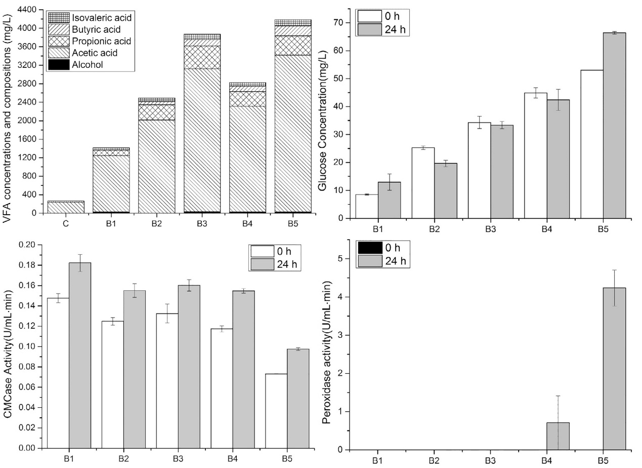 該研究組在近期研究中發(fā)現(xiàn),利用厚壁菌門中枯草芽孢桿菌(Bacillus subtilis)作為微氧預(yù)處理接種物,取代沼液菌群,可提高玉米秸稈厭氧發(fā)酵17.35%的產(chǎn)甲烷量,并將預(yù)處理溫度降低至37 。該工作于2018年7月發(fā)表于Bioresource Technology(2018,259,18-23)。與沼液菌群相比,利用Bacillus subtilis純菌液預(yù)處理后,產(chǎn)生過(guò)氧化物酶,酶活達(dá)4.24 U/mLmin;且在24h預(yù)處理后,木質(zhì)素水解率23.0%,半纖維素水解率18.1%,纖維素?fù)p失較少。本研究為微生物-微氧預(yù)處理強(qiáng)化厭氧發(fā)酵技術(shù)的產(chǎn)業(yè)化應(yīng)用提供理論支持,并為進(jìn)一步調(diào)控代謝途徑以提高纖維素生物質(zhì)水解率和甲烷產(chǎn)生量提供基礎(chǔ)支持。