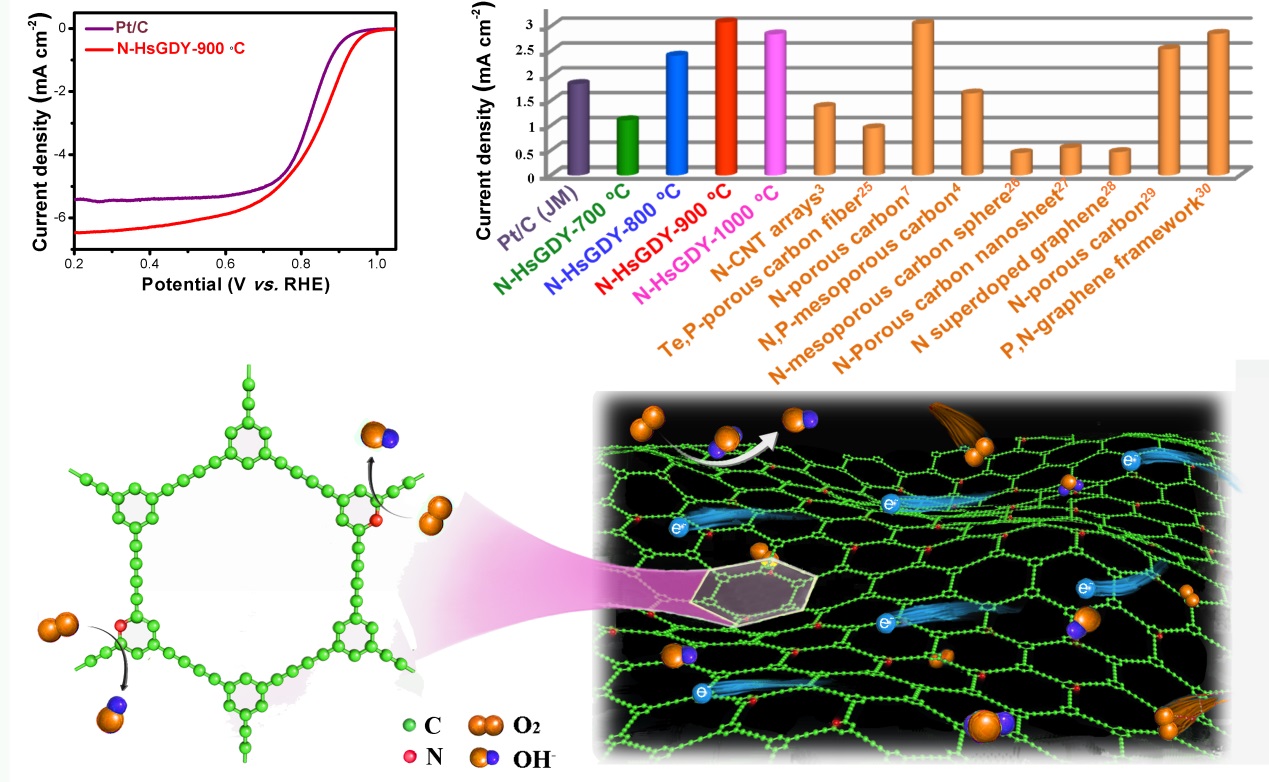 得益于HsGDY的獨(dú)特結(jié)構(gòu),在對(duì)其進(jìn)行后處理過程中,碳基材料與能源應(yīng)用研究組準(zhǔn)確控制了氮的摻入類型,選擇性摻入對(duì)燃料電池陰極電催化最有效的吡啶氮原子,從而實(shí)現(xiàn)了優(yōu)異的催化性能。同時(shí),HsGDY具有六邊形的大孔,其分子孔徑達(dá)1.63 nm,有利于催化反應(yīng)過程中反應(yīng)物和產(chǎn)物的傳質(zhì)。通過電化學(xué)測試發(fā)現(xiàn),吡啶氮摻雜的HsGDY在堿性條件下表現(xiàn)出了優(yōu)于商業(yè)碳載鉑催化劑的超高活性。其在0.85 V電位下的電流密度為商業(yè)碳載鉑催化劑的1.6倍,同時(shí)具有比碳載鉑更好的穩(wěn)定性和抗甲醇中毒能力。吡啶氮摻雜的HsGDY作為新型燃料電池陰極催化劑替代傳統(tǒng)鉑基催化劑,展現(xiàn)了巨大的潛力。這種通過碳材料結(jié)構(gòu)設(shè)計(jì),實(shí)現(xiàn)異原子的準(zhǔn)確摻雜的方法,也為制備其他摻雜型納米材料提供了新的思路。