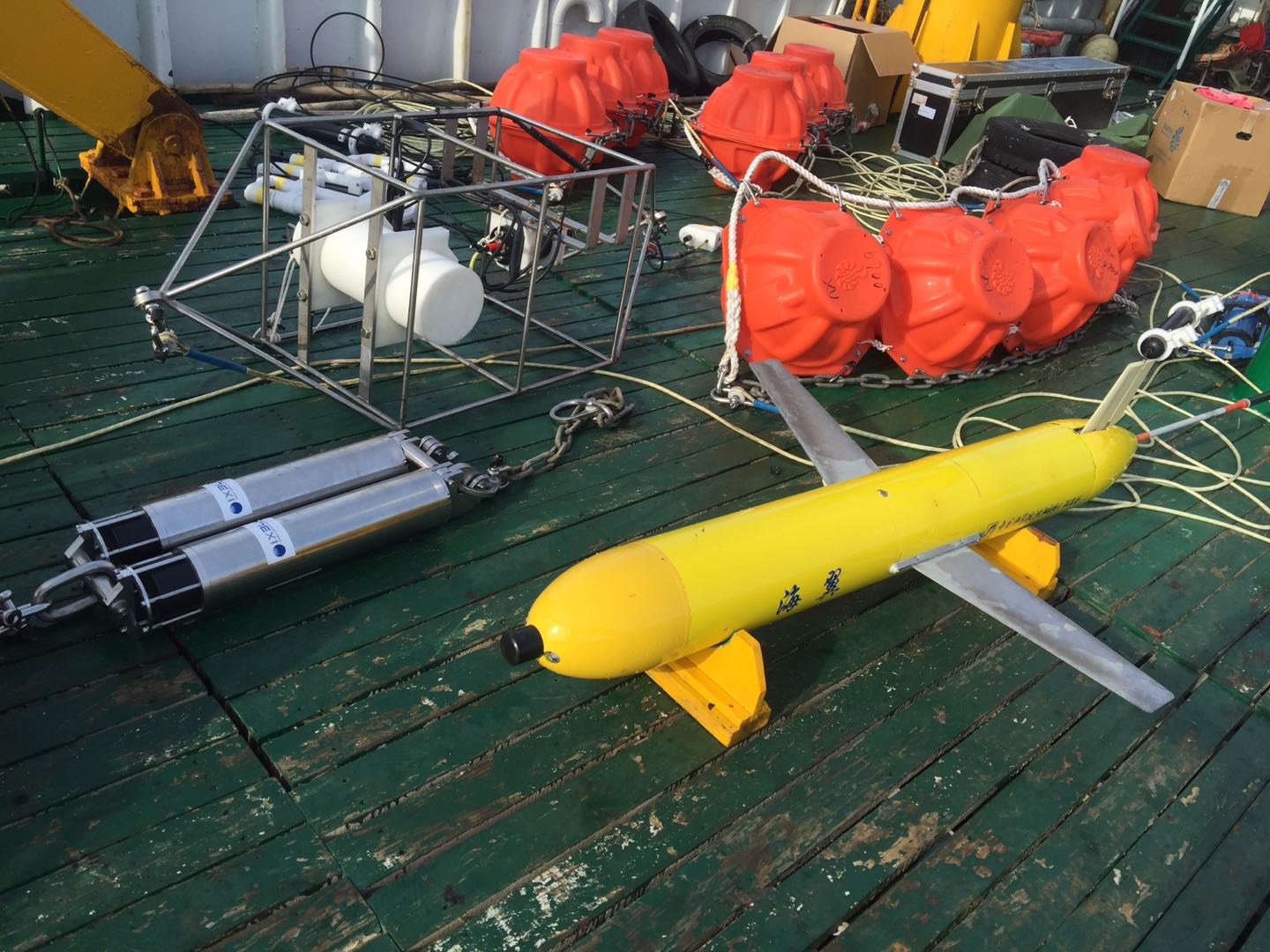 此次南海聯(lián)合試驗(yàn)由中科院沈陽自動化研究所與中科院深海研究所聯(lián)合開展,參試設(shè)備包括兩臺“海翼1000”聲學(xué)水下滑翔機(jī)和一套時效潛標(biāo)。兩臺水下滑翔機(jī)對試驗(yàn)區(qū)域的海洋環(huán)境參數(shù)與聲場信息進(jìn)行連續(xù)精細(xì)觀測,同時通過水聲通信機(jī)獲取時效潛標(biāo)的觀測數(shù)據(jù),并將數(shù)據(jù)通過衛(wèi)星通信發(fā)回岸基監(jiān)控中心。此次聯(lián)合海上試驗(yàn)的成功實(shí)施不僅拓展了“海翼”水下滑翔機(jī)的探測功能,還成功驗(yàn)證了一種移動-固定聯(lián)合觀測作業(yè)新模式,為解決潛標(biāo)觀測數(shù)據(jù)實(shí)時化問題提供一種全新解決途徑。