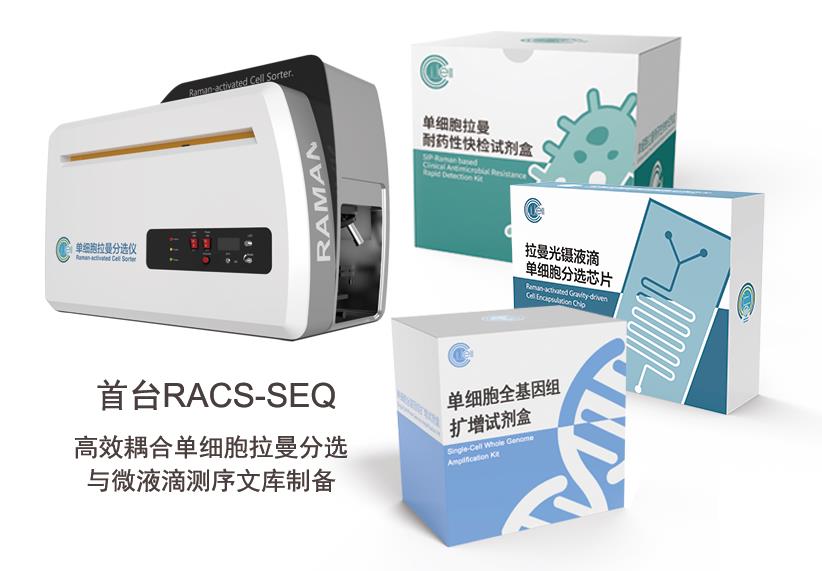 RACS-SEQ通過(guò)拉曼組(Ramanome)分析原理、拉曼光鑷液滴單細(xì)胞分選(RAGE)、流式微液滴單細(xì)胞拉曼分選(RADS)等關(guān)鍵器件的創(chuàng)新,在單細(xì)胞水平實(shí)現(xiàn)了非標(biāo)記式拉曼表型識(shí)別與功能分選,為單細(xì)胞生物學(xué)研究提供了嶄新的整體解決方案。該系統(tǒng)以免標(biāo)多維的表型組識(shí)別、精準(zhǔn)快捷的單細(xì)胞獲取,以及高效低噪的核酸擴(kuò)增等為三大特色,具有單細(xì)胞拉曼成像、表型組識(shí)別、功能分選以及測(cè)序文庫(kù)制備等四大功能。此外,系統(tǒng)還包括拉曼光鑷液滴單細(xì)胞分選芯片、單細(xì)胞全基因組擴(kuò)增試劑盒、單細(xì)胞拉曼耐藥性快檢試劑盒等附件。
