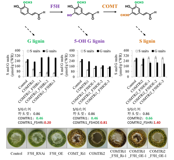 木質(zhì)素是一種由苯丙烷類結(jié)構(gòu)單元聚合而成的大分子化合物,在高等植物的細(xì)胞壁中廣泛存在,是自然界中儲(chǔ)量僅次于纖維素的第二豐富的有機(jī)物。木質(zhì)素的成分主要分為H、G和S三種類型,其含量和比例在不同植物(木本植物>草本植物)以及同一植物的不同組織器官(莖稈>葉片)中各不相同。在植物次生細(xì)胞壁中木質(zhì)素通過形成三維立體網(wǎng)狀結(jié)構(gòu),保護(hù)纖維素和半纖維素不被外界微生物輕易降解,同時(shí)賦予細(xì)胞壁足夠的強(qiáng)度和韌性。在農(nóng)作物的品種選育中,常將木質(zhì)素作為細(xì)胞壁品質(zhì)和抵抗逆境(尤其是抗倒伏)的一個(gè)重要參考指標(biāo)。另外,木質(zhì)素及其衍生物還是重要的化學(xué)品和生物燃料,具有較高的工業(yè)經(jīng)濟(jì)價(jià)值。 中國科學(xué)院青島生物能源與過程研究所付春祥研究員帶領(lǐng)的能源作物分子育種研究組長期致力于高細(xì)胞壁品質(zhì)的作物新品種培育,在木質(zhì)素合成的分子調(diào)控領(lǐng)域積累了豐富的研發(fā)經(jīng)驗(yàn)。木質(zhì)素合成途徑在植物中較為復(fù)雜,受到多個(gè)關(guān)鍵酶基因和調(diào)控因子的共同控制,因此調(diào)控單個(gè)酶基因,往往會(huì)潛在影響其上下游基因的協(xié)同改變。S型木質(zhì)素主要存在于硬木和草本植物細(xì)胞壁中,與造紙的制漿率、牧草的消化效率和生物乙醇的產(chǎn)量密切相關(guān)。能源作物分子育種研究組通過建立生物質(zhì)能源和牧草飼料雙用作物——柳枝稷的高效多基因遺傳轉(zhuǎn)化體系,對(duì)控制S型木質(zhì)素合成的兩個(gè)關(guān)鍵酶——阿魏酸-5-羥基化酶(F5H)和咖啡酸-O-甲基轉(zhuǎn)移酶(COMT)基因進(jìn)行了分子調(diào)控,發(fā)現(xiàn)上述兩個(gè)酶基因之間存在顯著的協(xié)同調(diào)控效應(yīng)。進(jìn)而通過分子設(shè)計(jì)最終獲得了具有不同木質(zhì)素結(jié)構(gòu)的柳枝稷種質(zhì)新資源,用于今后高抗逆高細(xì)胞壁品質(zhì)的優(yōu)良牧草和能源草培育。該研究表明,當(dāng)通過RNA干擾技術(shù)對(duì)木質(zhì)素合成途徑的COMT基因表達(dá)進(jìn)行抑制時(shí),會(huì)導(dǎo)致S型木質(zhì)素的顯著降低,同時(shí),其上游的F5H基因表達(dá)水平會(huì)受到誘導(dǎo)發(fā)生改變。在COMT基因表達(dá)抑制的背景中,進(jìn)一步調(diào)低其上游F5H基因的表達(dá)時(shí),能夠加劇下游COMT基因表達(dá)抑制對(duì)S型木質(zhì)素合成的影響;相反,當(dāng)調(diào)高上游F5H基因的表達(dá)后,能夠部分甚至完全消除下游COMT基因表達(dá)抑制對(duì)S型木質(zhì)素積累的影響。該結(jié)果清晰地表明,F(xiàn)5H和COMT在S型木質(zhì)素合成過程中存在顯著的協(xié)同作用。