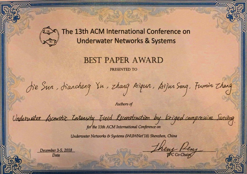 孫潔與沈陽自動化所俞建成研究員、張艾群研究員、張福民客座研究員及美國阿拉巴馬大學宋愛軍教授合著的論文Underwater Acoustic Intensity Field Reconstruction by Kriged Compressive Sensing被會議組委會評為最佳論文,榮獲最佳論文獎(Best Paper Award)。該論文以多水下移動平臺聲學測量為背景,提出克里金-壓縮感知算法,用于水下聲場空間場重構,獲取高精度聲強空間分布場,并應用于“海翼1000”聲學水下滑翔機海洋環(huán)境噪聲觀測數(shù)據(jù)處理。