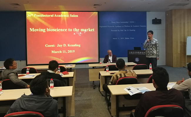 3月11日上午,中國科學(xué)院大連化學(xué)物理研究所第三十六期博士后學(xué)術(shù)沙龍?jiān)谏飿菍W(xué)術(shù)報(bào)告廳舉行,本期沙龍主題是“Moving Bioscience to the Market”,沙龍?zhí)匮⑸飳W(xué)專家伯克利加州大學(xué)Jay D. Keasling教授為做客嘉賓,大連化物所青年職工、博士后、研究生等20余人參加活動(dòng)。