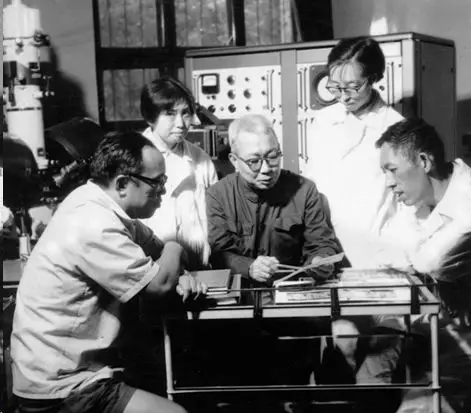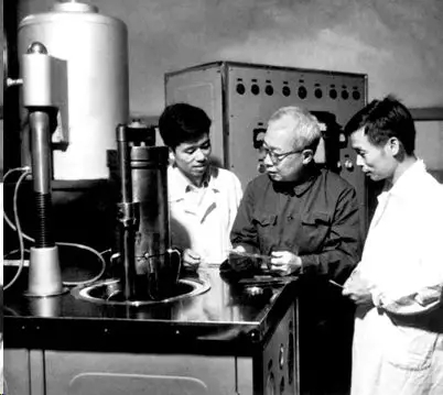 70年代初期李薰(中)在金屬所實(shí)驗(yàn)室與莊育智(右一)等討論難熔金屬的熔煉問題