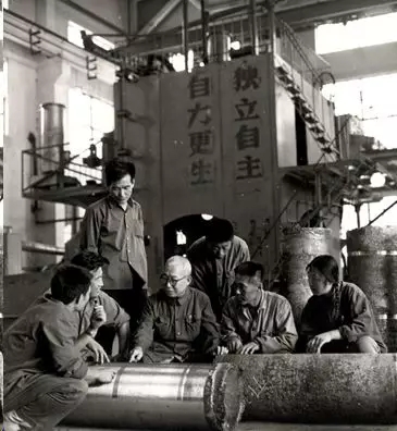 1972年8月李薰在沈陽814廠與技術(shù)人員討論鉬合金的質(zhì)量問題,這是我國第一顆返回式地面人造衛(wèi)星的蒙皮材料,由金屬所與814廠合作完成。