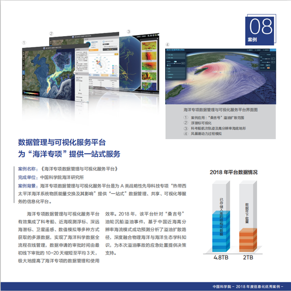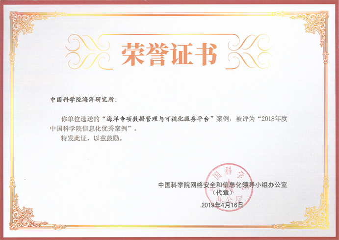近日,中國科學(xué)院在全院范圍內(nèi)開展科研信息化優(yōu)秀應(yīng)用案例評選工作,中科院海洋所海洋大數(shù)據(jù)中心設(shè)計研發(fā)的“海洋先導(dǎo)專項(xiàng)數(shù)據(jù)管理與可視化平臺”被評為2018年度中國科學(xué)院科研信息化優(yōu)秀案例,并入選《中國科學(xué)院信息化年度報告(2018)》 。