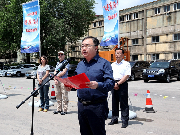 王凡所長(zhǎng)在煙臺(tái)向“健康海洋”黃河口航段科考隊(duì)員授旗
