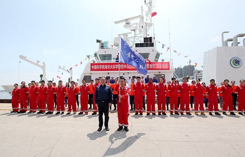 李超倫副所長(zhǎng)、科考船運(yùn)管中心總工于非在青島向南黃海航段和長(zhǎng)江口航段科考隊(duì)員授旗