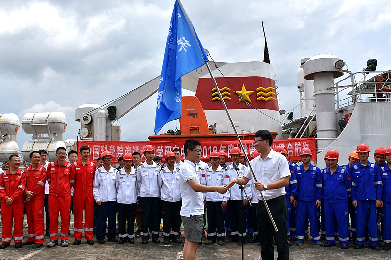 南海海洋所所長(zhǎng)助理孫龍濤向珠江口航段科考隊(duì)員授旗