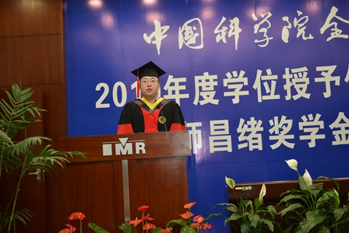2016級博士生盧正冠同學(xué)代表全體畢業(yè)生發(fā)言。他首先向在學(xué)期間提供指導(dǎo)、幫助和關(guān)心的老師表示感謝。今年正是建國、建院70周年,盧正冠深情回顧了中國科大的光輝歲月以及自己來所后的心態(tài)轉(zhuǎn)變,分享了自己的心路歷程和感悟。發(fā)言的最后,他以師昌緒先生的話作結(jié),與全體畢業(yè)生共勉:人生在世,首先要有一個(gè)正確的人生觀,要對人類有所貢獻(xiàn)。作為一個(gè)中國人,就要對中國做出貢獻(xiàn),這是人生的第一要義。