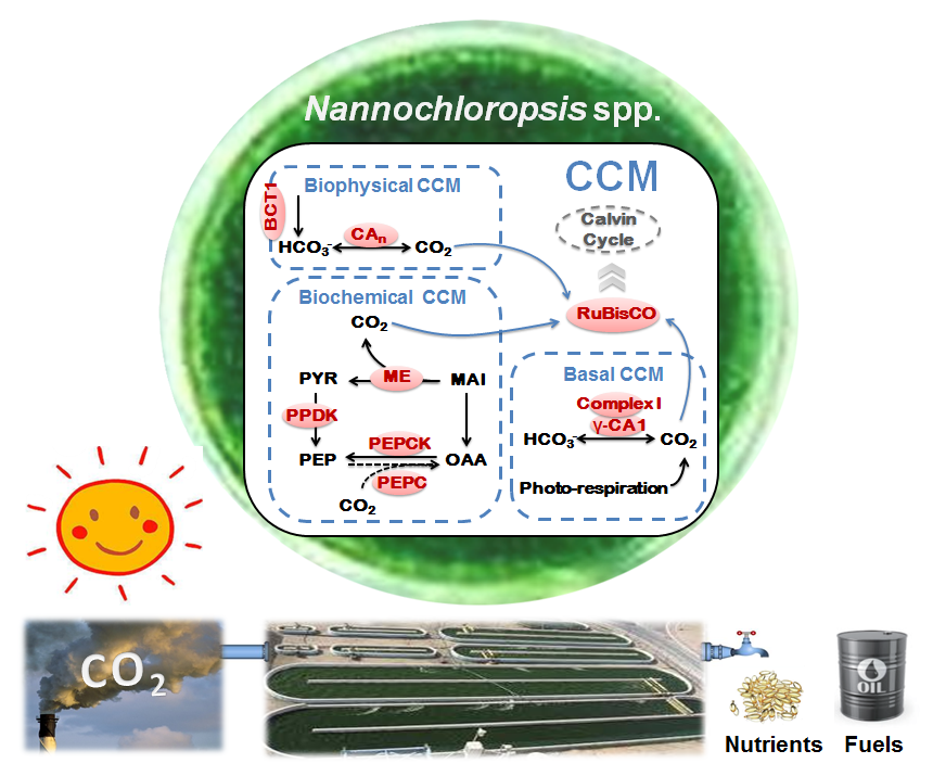 人類(lèi)社會(huì)排放的CO2等溫室氣體,造成全球氣候變暖和海洋酸化,探索和實(shí)施碳減排途徑和方法已刻不容緩。利用微藻將工業(yè)源CO2直接轉(zhuǎn)化為生物燃料,在碳中性能源體系的建設(shè)中具有重要的戰(zhàn)略意義。但是,工業(yè)微藻如何高效固定CO2呢?青島能源所單細(xì)胞中心等發(fā)現(xiàn),作為一種工業(yè)產(chǎn)油微藻,微擬球藻細(xì)胞集至少三種碳濃縮機(jī)制(CO2 Concentrating Mechanism,CCM)的特征于一身。這一全局性的CCM系統(tǒng)結(jié)構(gòu)藍(lán)圖的揭示,為在工業(yè)微藻中設(shè)計(jì)和改造“超級(jí)二氧化碳固定模塊”奠定了基礎(chǔ)。 目前地球大氣中的CO2含量約0.04%。為了將環(huán)境中如此低濃度的CO2富集在葉綠體中Rubisco(核酮糖-2-磷酸羧化氧化酶)的周?chē)瑥亩M(jìn)行高效的光合作用,自養(yǎng)生物進(jìn)化出了形形色色的CCM系統(tǒng),在細(xì)胞代謝網(wǎng)絡(luò)中主動(dòng)地供應(yīng)或回收無(wú)機(jī)碳分子。因此,CCM系統(tǒng)蘊(yùn)含著挖掘和改造微藻細(xì)胞工廠固碳能力的奧妙。