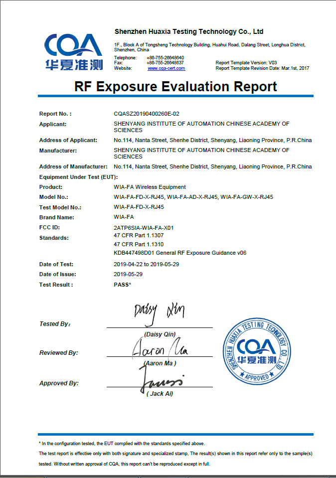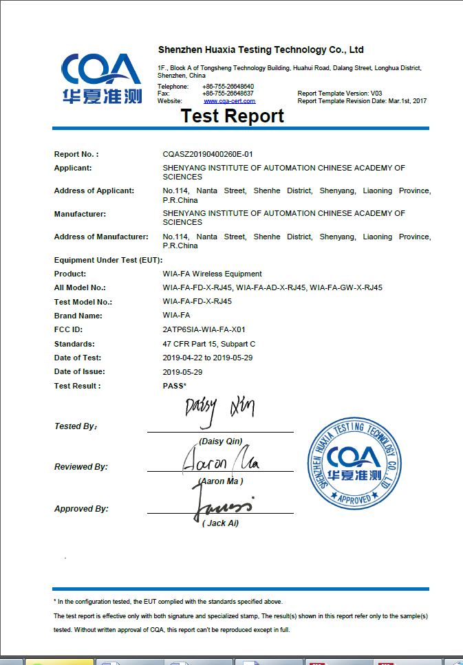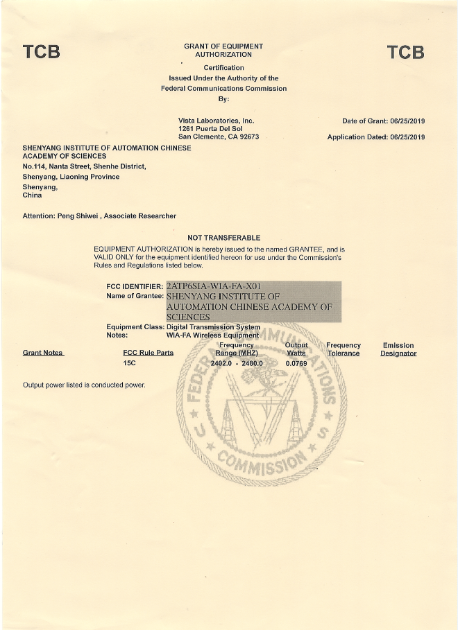 近日,由中國科學院沈陽自動化研究所開發(fā)的面向工廠自動化應(yīng)用的高實時、高可靠無線通信網(wǎng)絡(luò)產(chǎn)品WIA-FA,順利通過美國FCC(Federal Communications Commission,美國聯(lián)邦通信委員會)認證并獲得證書。