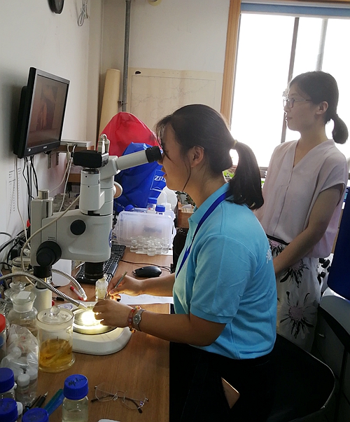 營(yíng)員通過(guò)解剖鏡觀察鼓蝦標(biāo)本