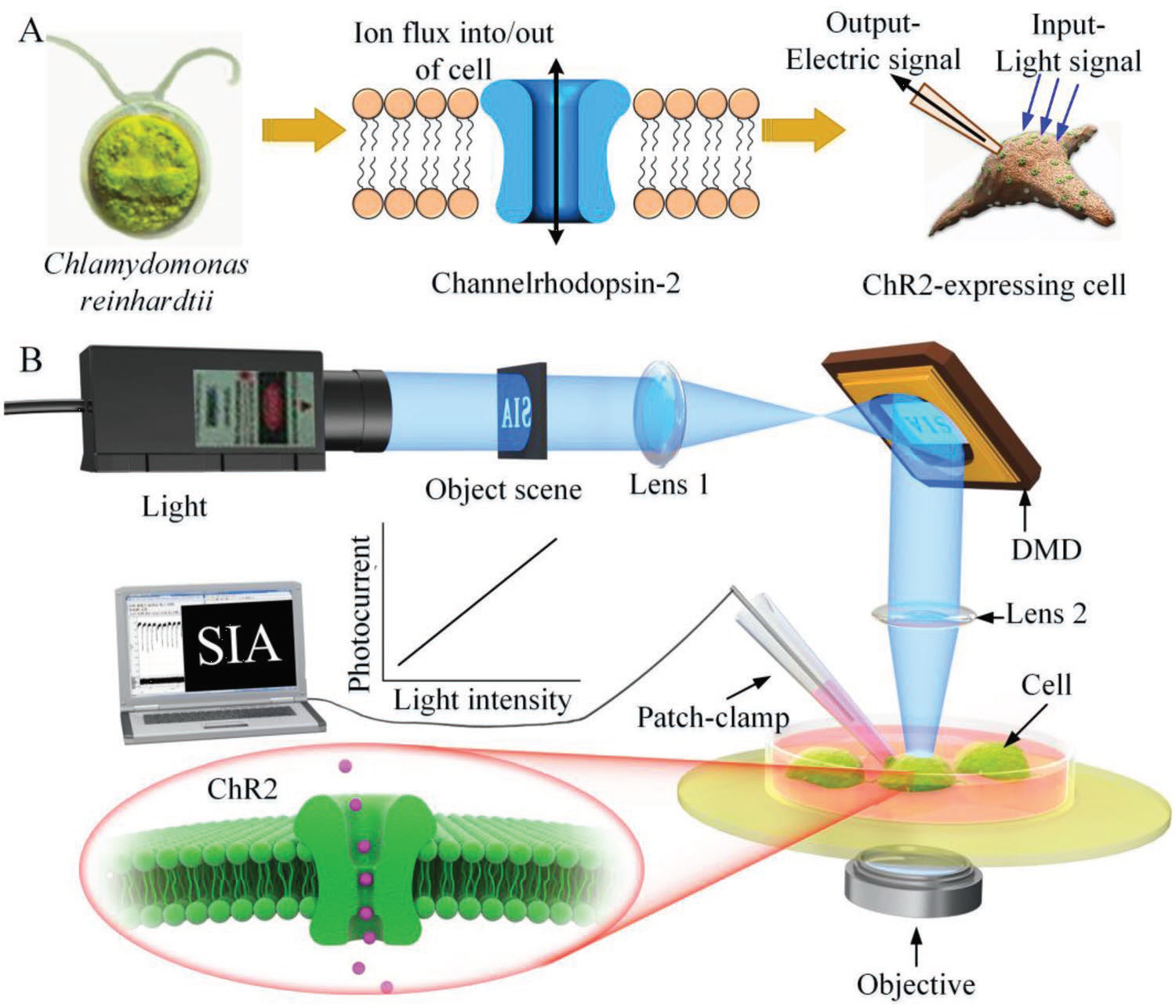 在題為Imaging with Optogenetically Engineered Living Cells as a Photodetector的研究論文中,微納米課題組科研人員在國際上首次利用光遺傳學工具實現(xiàn)了功能化細胞視覺感知成像:利用光遺傳學工具將來源于萊茵衣藻細胞的ChR2質粒成功轉染在Hek293細胞構建光敏細胞,并以此細胞為基礎建立類生命光電器件;利用單像素成像框架,構建了類生命視覺成像系統(tǒng),實現(xiàn)了對宏觀字符的高清晰成像。該工作首次搭建了類生命視覺感知成像物理樣機,并用活體生物細胞成功實現(xiàn)了對宏觀目標的高清晰成像。此外,相對目前部分光電傳感器件,類生命光電器件在光敏感動態(tài)范圍、光強適應性等方面已經(jīng)表現(xiàn)出了明顯的優(yōu)勢。該工作不僅是在類生命機器人感知研究上新的探索和突破,也為未來在體視覺假體的發(fā)展提供了一種新的研究思路。