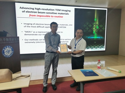 在報(bào)告中,韓宇詳細(xì)介紹了其研究團(tuán)隊(duì)開發(fā)的一種最新的低劑量高分辨透射電鏡成像技術(shù),對(duì)電子束敏感材料進(jìn)行原子級(jí)高分辨透射電鏡成像和分析。他以Uio-66、MIL-101、NU-1000、ZIF-8等MOF材料為實(shí)例,講解了這種成像和分析技術(shù)在研究電子束敏感材料的微觀結(jié)構(gòu)、結(jié)構(gòu)缺陷、客體分子、表界面微觀原子排布等方面的強(qiáng)大優(yōu)勢;通過Mo/ZSM-5實(shí)例,描述了這種技術(shù)在研究分子篩孔道中客體分子分布的潛在可能。報(bào)告后,韓宇和與會(huì)人員進(jìn)行了熱烈討論,對(duì)提出的問題一一做了詳盡的解答,為以后的交流與合作奠定了良好的基礎(chǔ)。