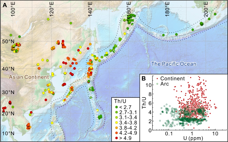 孫衛(wèi)東研究員指導(dǎo)其博士后劉鶴,聯(lián)合國外科學(xué)家以全新手段和視角對全球性氧化事件的發(fā)生時(shí)間進(jìn)行了限定。研究發(fā)現(xiàn),在當(dāng)今地球上,形成于阿留申群島、堪察加半島、千島島弧、日本群島和琉球群島的弧巖漿巖中Th元素含量和U元素含量的比值(Th/U)明顯低于亞洲東部的內(nèi)陸型巖漿巖。Th和U是地球化學(xué)性質(zhì)十分相近的兩種元素,因此不同巖性的巖漿巖中的平均Th/U基本保持一致。弧巖漿巖具有低Th/U的原因是在大氣和海水中氧氣的氧化作用下,地表河流和海水中的U元素主要以溶于水的U6+形式存在,但Th元素仍以不溶于水的Th4+形式存在,致使現(xiàn)代海水中的U元素含量遠(yuǎn)高于Th元素含量,從而造成蝕變的海底洋殼具有低Th/U。這些蝕變洋殼在沿俯沖帶向深部俯沖過程中,通過洋殼脫水等作用將其低Th/U的特征隨著流體運(yùn)移最終帶入到俯沖帶上方形成的弧巖漿巖中。